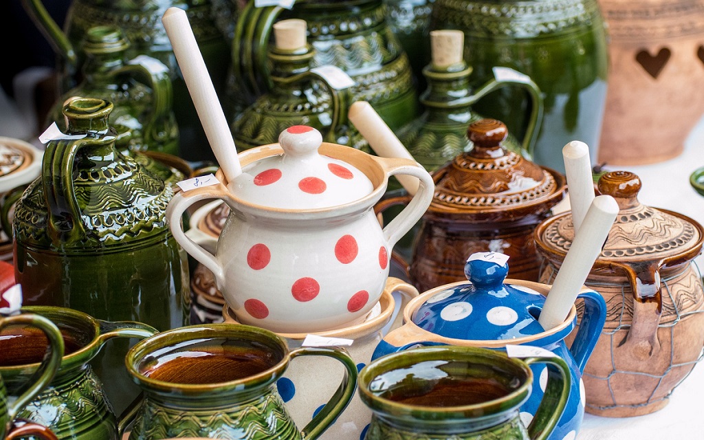 Un espositore mette in bella mostra il suo vasellame. Ci sono piatti di maiolica, ci sono scodelle in porcellana, ci sono contenitori per ogni spezia possibile che possa servire in cucina.